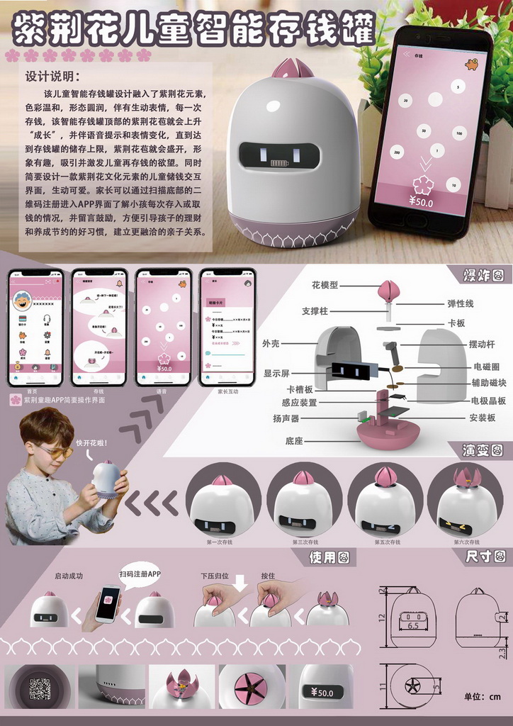 该儿童智能存钱罐设计融入了紫荆花元素,象征家庭美满。产品造型简单圆滑,大大降低对儿童产生的安全危险。色彩温和,存钱罐屏幕较小,减少电子产品的辐射。屏幕伴有生动
