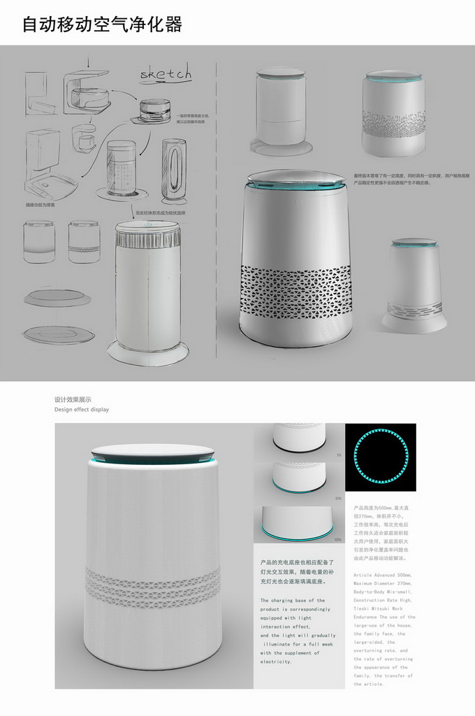产品高度为500mm,最大直径270mm,体积并不小,工作效率高,每次充电后工作持久适合家庭面积较大用户使用,家庭面积大引发的净化覆盖率问题也由此产品移动功能解决。